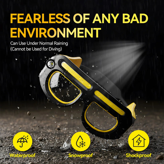 Wiederaufladbare LED-Stirnlampe in Brillenform – Gestensteuerung, 5 Lichtmodi, USB-C. Ideal für Laufen, Camping, Nachtarbeit, Reparaturen und handfreies Arbeiten.